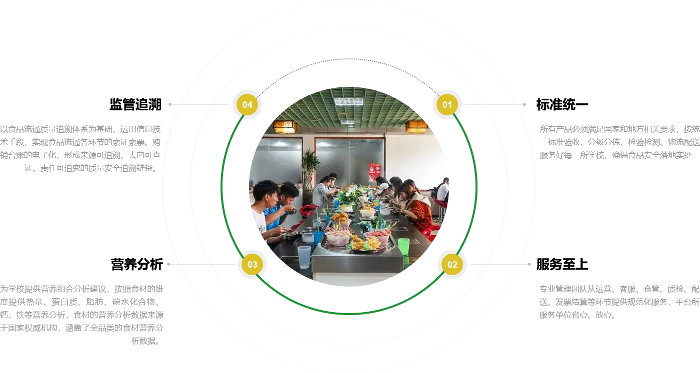 ayx爱游戏校园营养餐聚焦中小学,着眼公共食堂食品安全,依托标准的运营与严格的管理,以数字化食安监管平台为核心,确保食材供应实现全溯源、全检测, 保障食品安全,用心关爱学生每一餐。